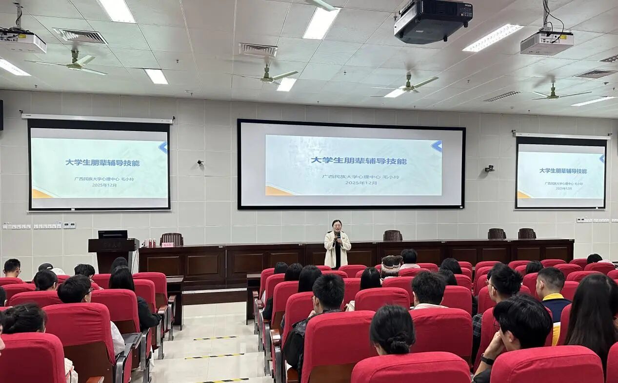 本次培训邀请广西民族大学大学生心理健康教育中心副主任毛小玲、广西警察学院心理中心主任明秀峰担任主讲嘉宾,采用“理论+技能”互动教学形式,聚焦心理委员的实际工作需要展开。